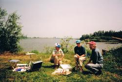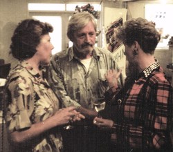Peter Unger met twee dames van de kunstcommissie van het Drechtstedenziekenhuis, tijdens de voorbereiding van de expositie van Tesch '87, september 1992.